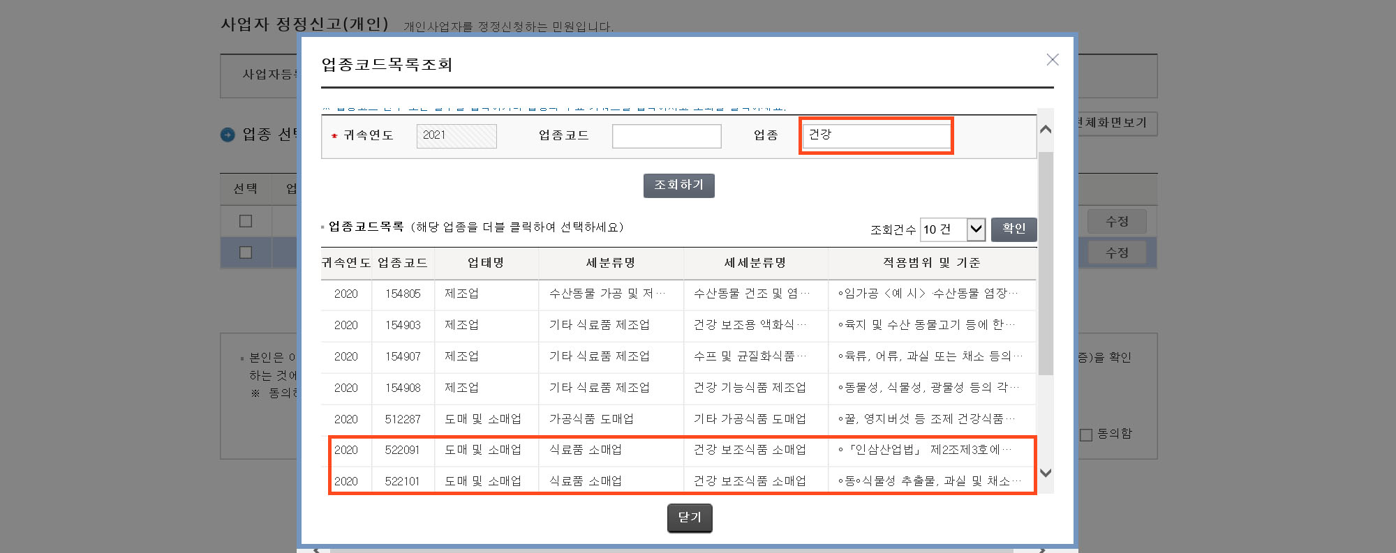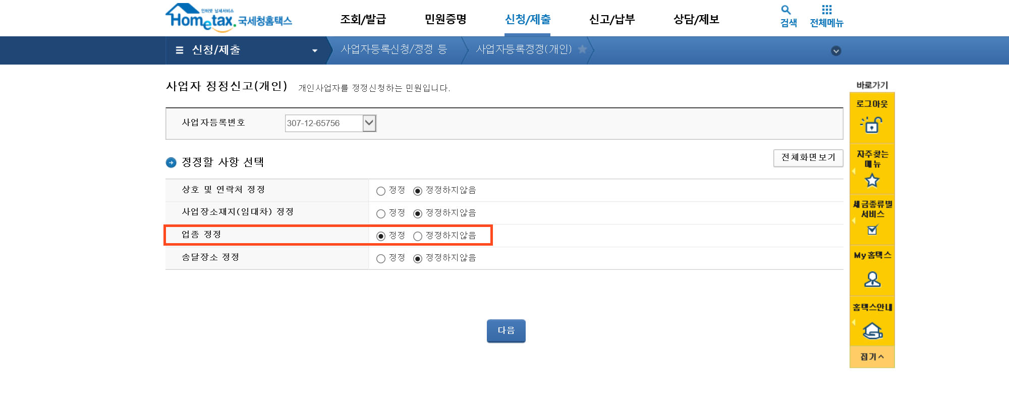 업종 정정을 체크한다.