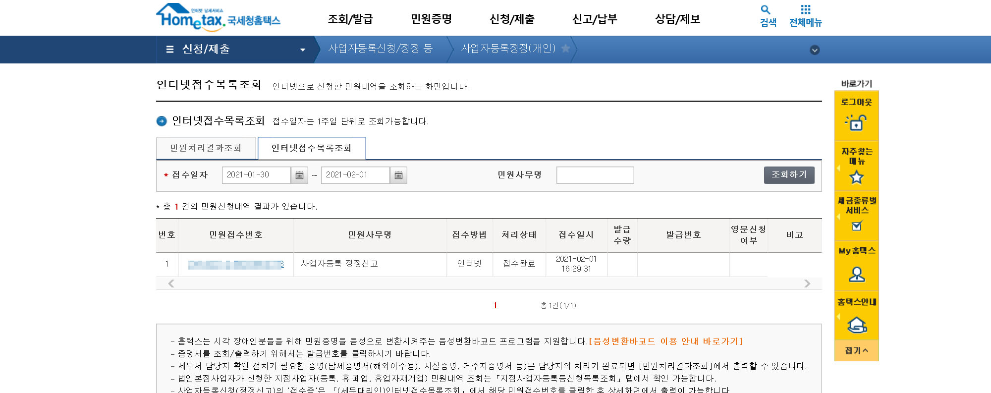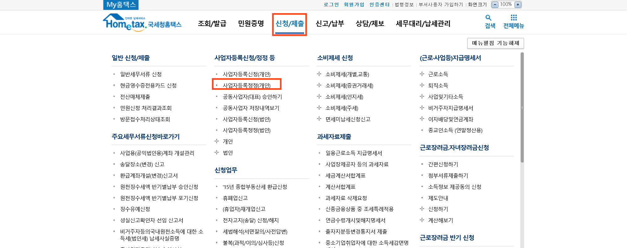 신청/제출 탭에서 사업자 등록 정정(개인)을 누른다.
