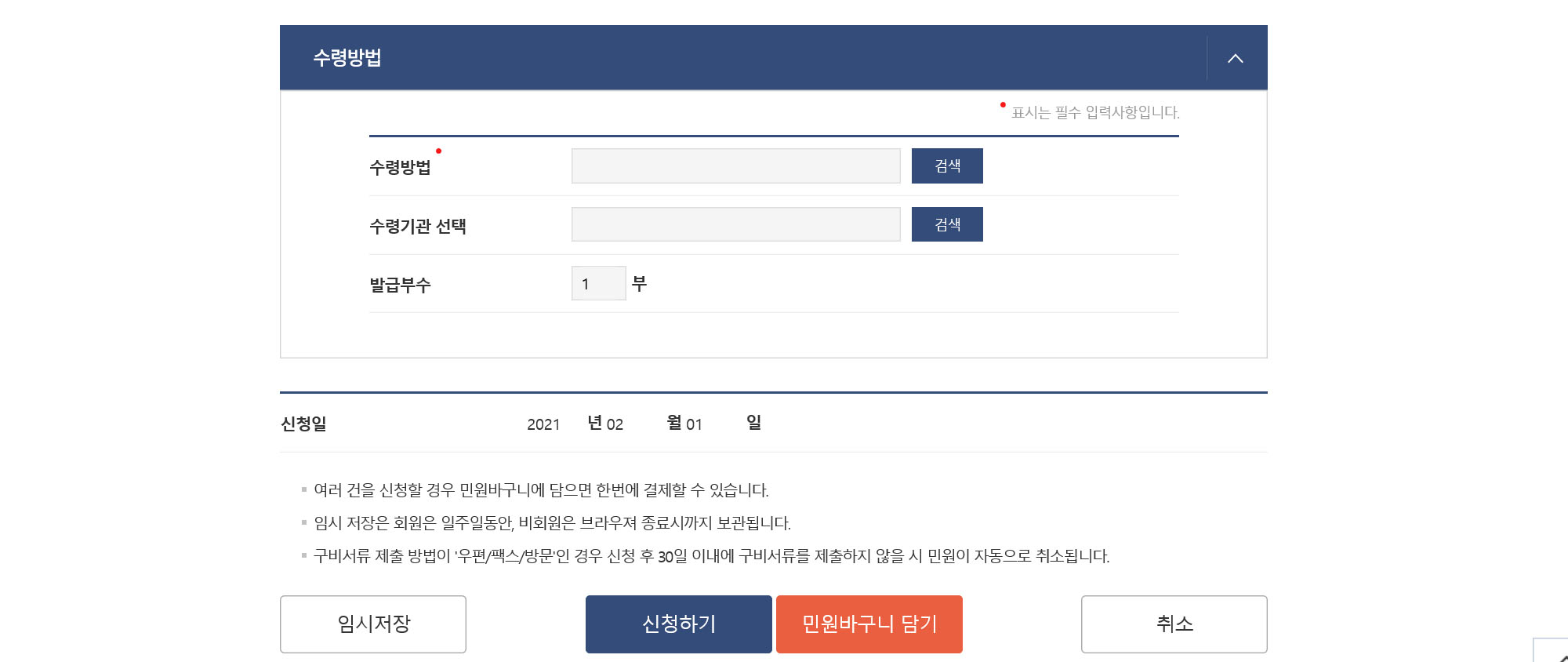 수령방법은 인터넷 출력을 선택한다.