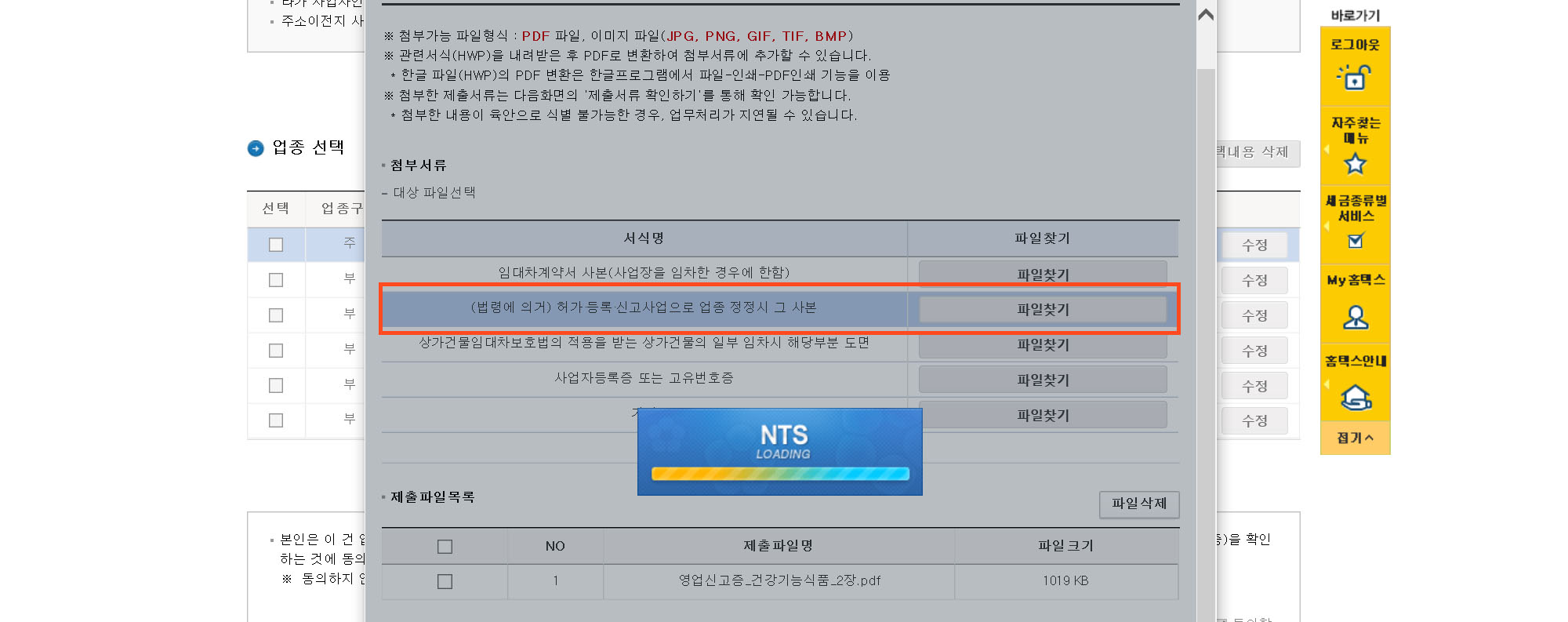 업종에 건강보조식품 소매업을 추가하고, 그 밑에 첨부파일에 바뀐 사업자 등록증을 첨부한다.