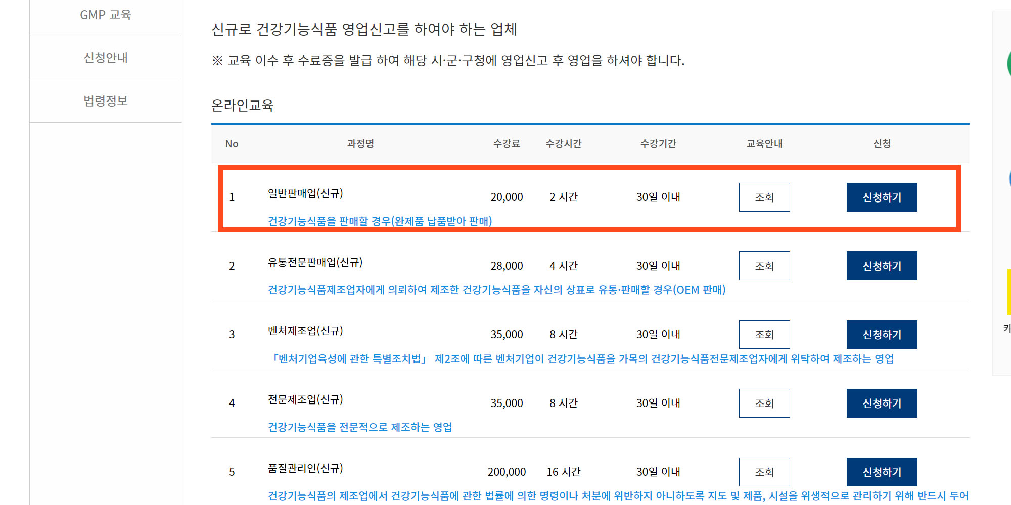 처음 가입할 때는 건강기능식품 영업신고를 위한 교육을 클릭한다.