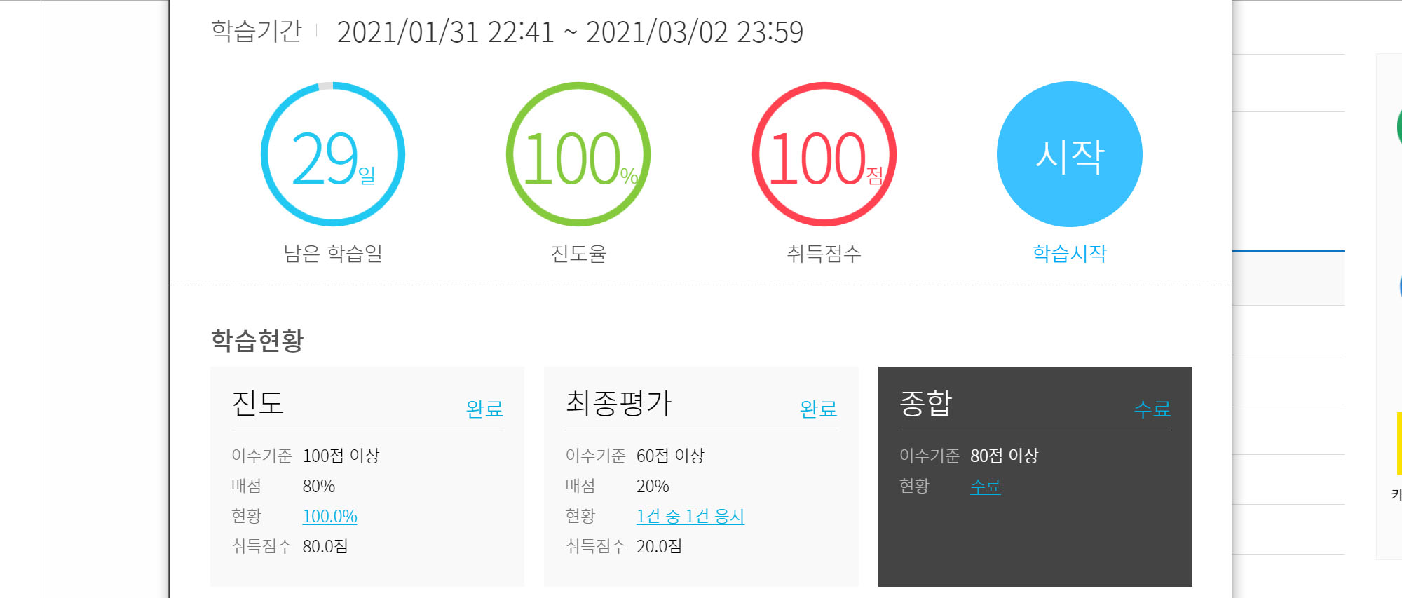 그렇게 2시간의 강의를 듣고 나면 마지막에 5문항 정도의 시험을 보게 되는데 60점이 넘어야 수료가 완료된다. 시험 문제는 그리 어렵지 않으니, 걱정하지 않아도 된다.