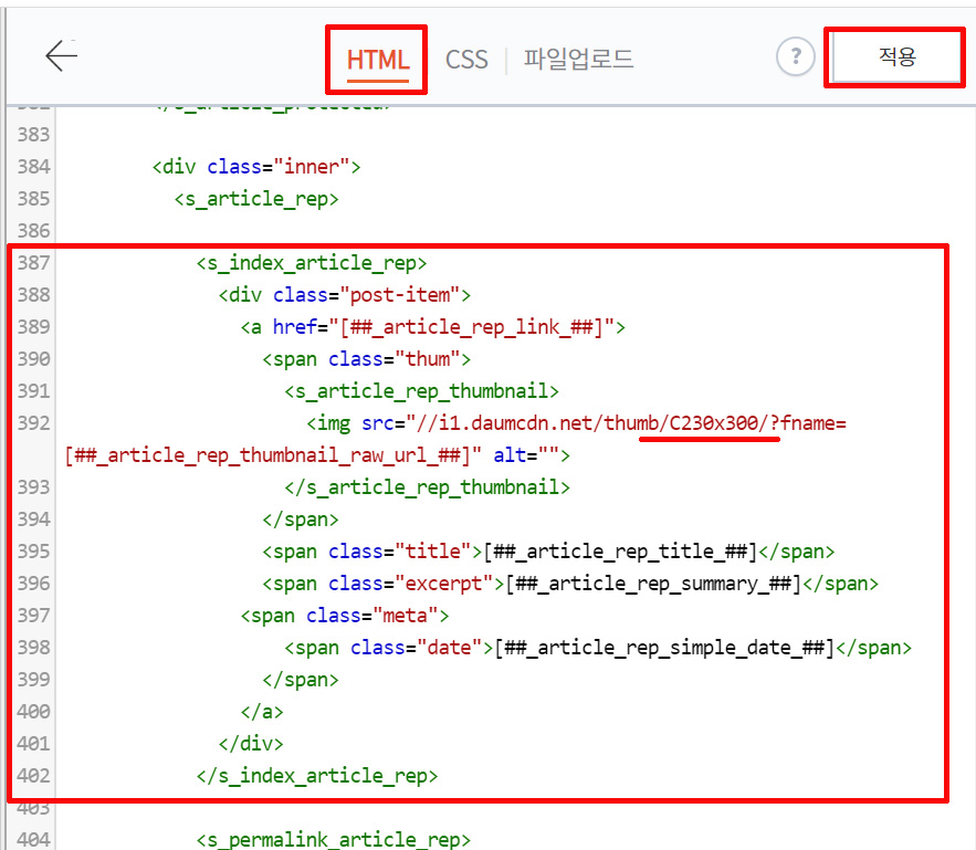 387 정도에 있는 항목을 수정한다. 아마, 이미 HTML에 다른 태그들을 추가했을 경우 387이 아닌 더 아랫단에 이 항목이 있을 것이다. 저 숫자 근처나, cltr+F로 'index_article_rep'을 쓰고 저 항목을 찾는다.