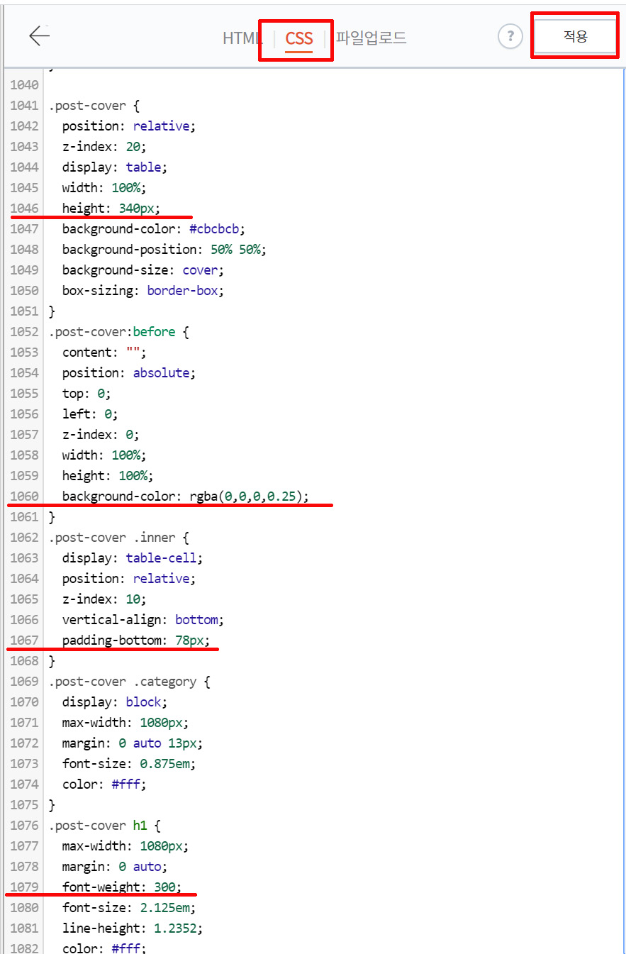 글 제목의 글자 두께를 좀 더 굵게 만들기 위해서 CSS 1079번 줄 font-weight를 300에서 500으로 조정한다. 숫자가 올라갈수록 두꺼워진다.