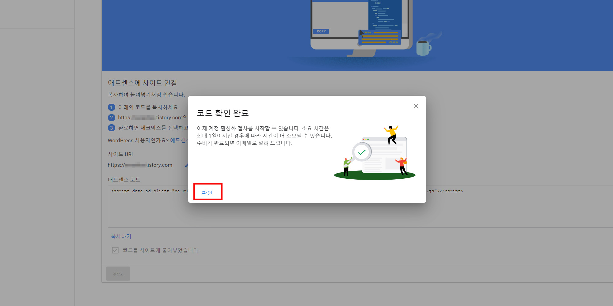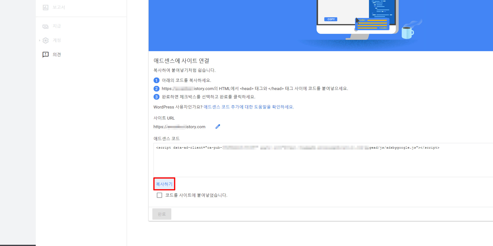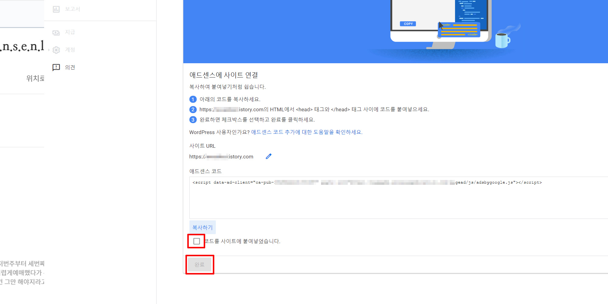 그리고 구글 애드센스로 돌아와 아래 붙여 넣었다는 것에 체크를 하고 완료를 누른다.