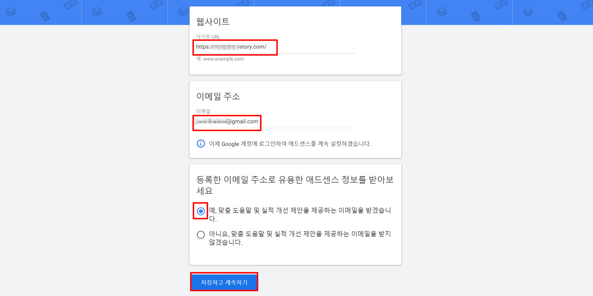 그리고, 자신의 티스토리 주소와 이메일 주소를 입력하고 계속하기를 누른다.