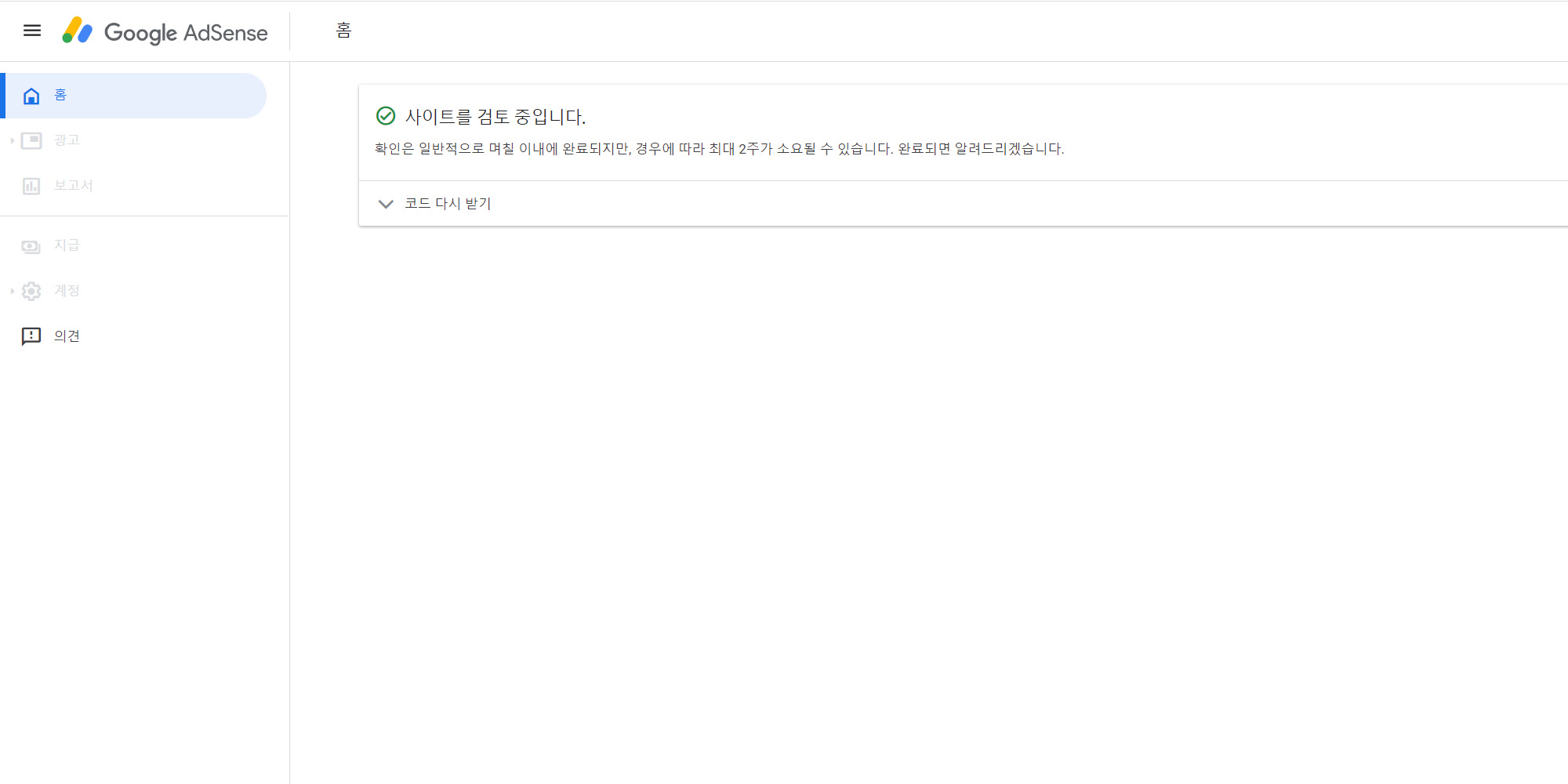 이렇게 완료가 되면 사이트를 검토증이라고 첫 페이지에 메세지가 떠 있다. 이는 승인 전까지 유지된다.