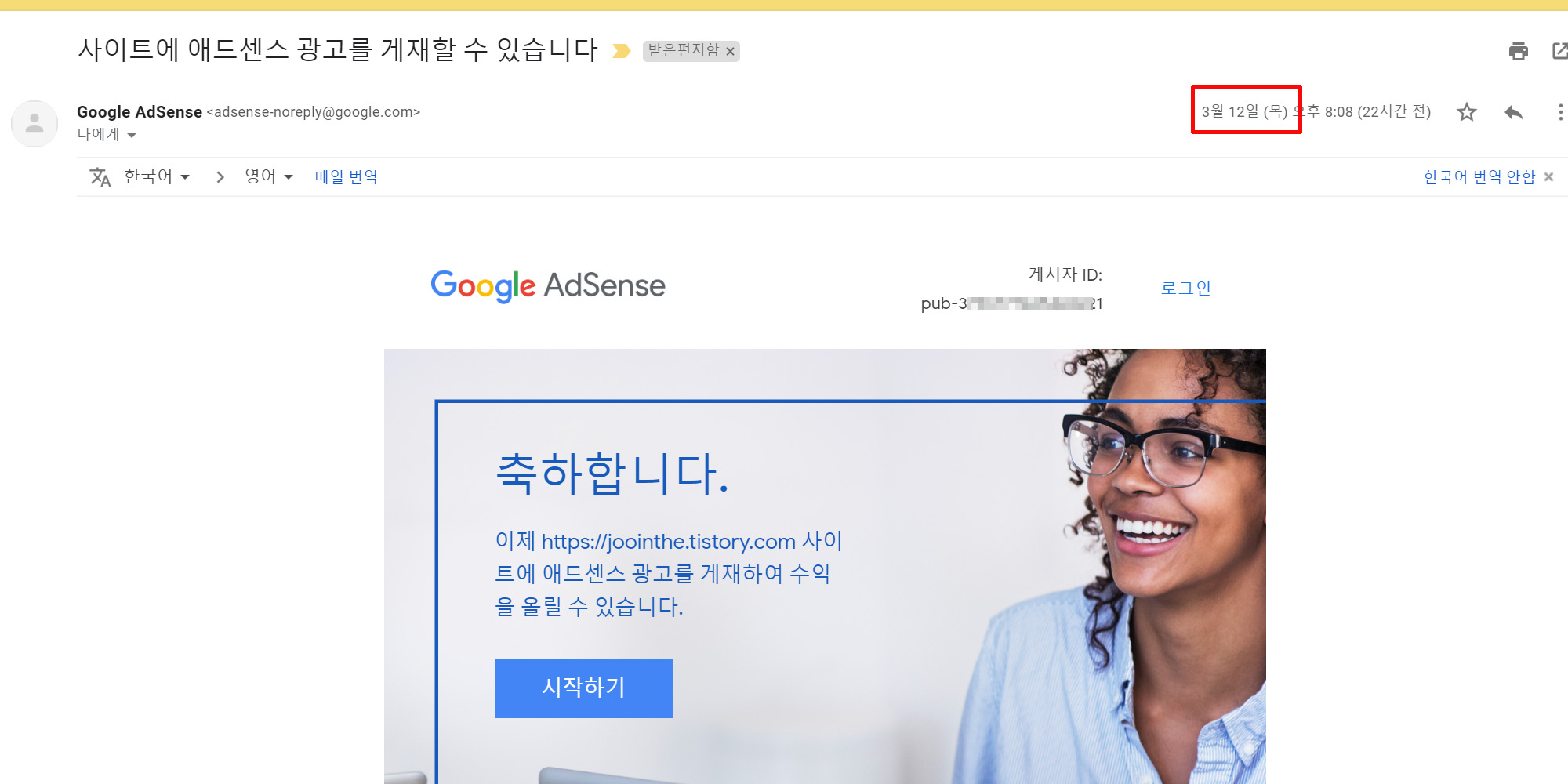 그리고 드디어 10일 만에 축하합니다 라는 이메일이 왔다. 이렇게 구글 애드센스가 가입 후 승인이 났다.