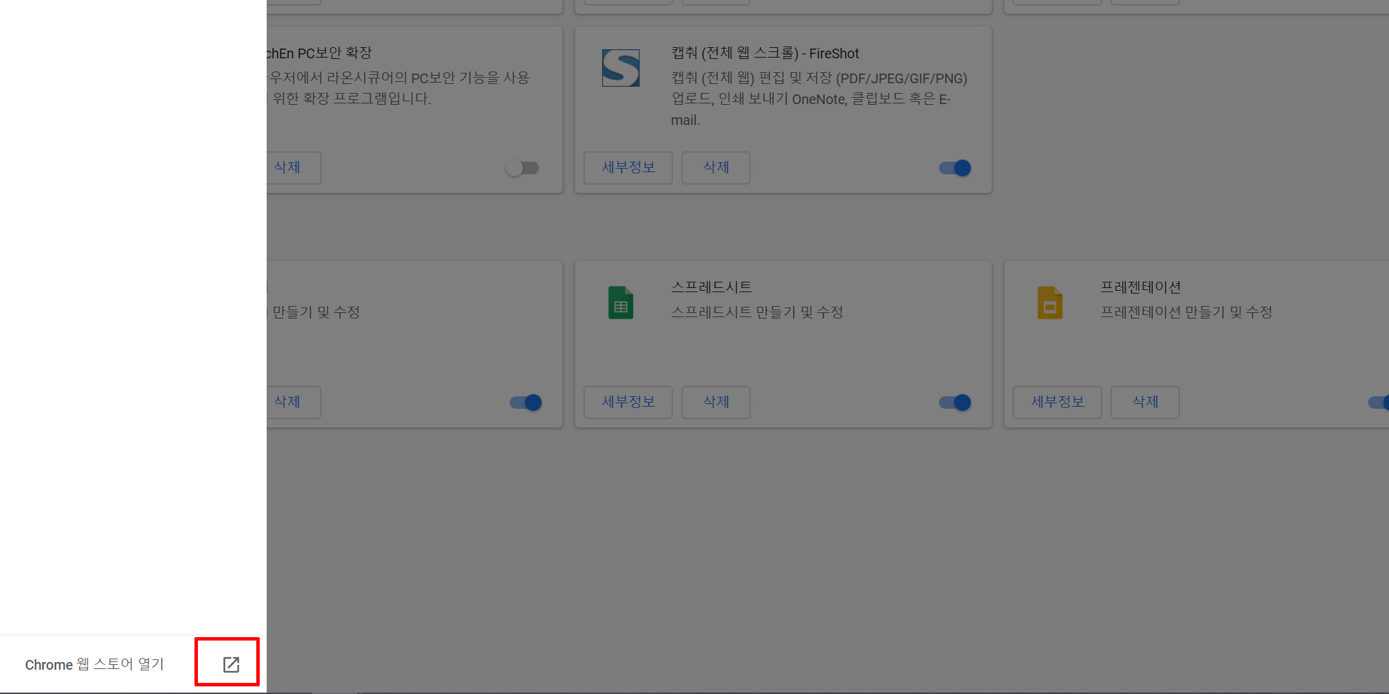 그리고 하단의 크롬 웹 스토어 열기를 클릭한다.