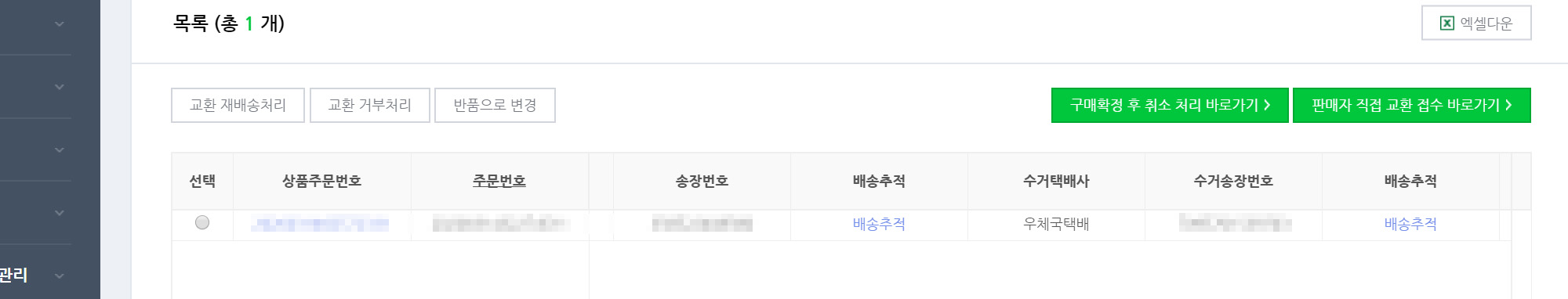 그리고 네이버에서는 이미 빠르게 자동수거 지시를 우체국 택배에 내렸을 것이다. 그래서 교환 관리 페이지에서 항목의 스크롤을 오른쪽으로 계속 가져가서 보면 수거 택배사가 나오고 수거 송장번호가 떠 있을 것이다.